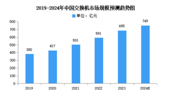 云計算、大數(shù)據(jù)、5G、物聯(lián)網(wǎng)等信息技術(shù)的應(yīng)用為網(wǎng)絡(luò)設(shè)備行業(yè)帶來了新的發(fā)展機遇。同時,國家不斷在產(chǎn)業(yè)政策層面鼓勵與支持信息化建設(shè),如“互聯(lián)網(wǎng)+”、工業(yè)4.0和新基建等,我國的網(wǎng)絡(luò)設(shè)備行業(yè)迎來發(fā)展機遇。交換機在中國網(wǎng)絡(luò)設(shè)備市場占據(jù)了絕大部分市場份額,2022年市場規(guī)模達到約為591億元,同比增長17.96%,2023年約為685億元。隨著交換機在數(shù)據(jù)中心網(wǎng)絡(luò)、園區(qū)網(wǎng)絡(luò)、工業(yè)互聯(lián)網(wǎng)等下游各類網(wǎng)絡(luò)環(huán)境中的應(yīng)用, 2024年中國交換機市場規(guī)模將增至749億元。