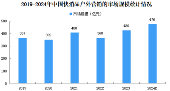 2020年至2022年,與公共環(huán)境(如交通場景)密切相關(guān)的快消品戶外營銷市場受到了新冠疫情的不利影響,導(dǎo)致公共場所行人流量減少,進(jìn)而減少了快消品品牌在營銷活動中的投資。自2023年起,快消品戶外營銷市場正在復(fù)蘇,未來市場增長潛力巨大。2024年中國快消品戶外營銷的市場規(guī)模476億元。