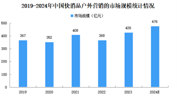 依托中國快消品行業(yè)的持續(xù)增長,以及快消品戶外營銷服務(wù)有效滿足快消品品牌未滿足需求的優(yōu)勢和能力?煜窇敉鉅I銷的市場規(guī)模從2019年的367億元增長到2023年的426億元,2019年至2023年的年復(fù)合增長率為3.8%。2020年至2022年,與公共環(huán)境(如交通場景)密切相關(guān)的快消品戶外營銷市場受到了新冠疫情的不利影響,導(dǎo)致公共場所行人流量減少,進(jìn)而減少了快消品品牌在營銷活動(dòng)中的投資。自2023年起,快消品戶外營銷市場正在復(fù)蘇,未來市場增長潛力巨大。2024年中國快消品戶外營銷的市場規(guī)模476億元。
