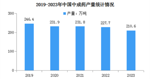 中成藥是以中藥材為原料,在中醫(yī)藥理論指導(dǎo)下,為了預(yù)防及治療疾病的需要,按規(guī)定的處方和制劑工藝將其加工制成一定劑型的中藥制品,是經(jīng)國家藥品監(jiān)督管理部門批準(zhǔn)的商品化的一類中藥制劑。近年來,在醫(yī)?刭M(fèi)、重點(diǎn)監(jiān)控輔助用藥、限輸令、新藥審批從嚴(yán)等政策影響下,我國中成藥的產(chǎn)量整體呈下降趨勢,由2019年的246.4萬噸下降至2022年的227.7萬噸。2023年,我國中成藥產(chǎn)量210.6萬噸,同比下降7.5%。