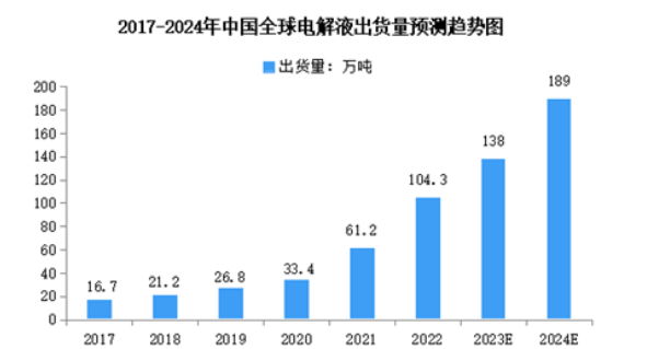 近年來,電解液下游應(yīng)用不斷豐富,新能源汽車、電網(wǎng)儲能、家庭光儲系統(tǒng)等都有著較大的成長空間,促進(jìn)鋰離子電池材料行業(yè)蓬勃發(fā)展。2022年全球電解液出貨量達(dá)104.3萬噸,同比增長70.4%。2024年全球電解液出貨量將增長至189萬噸。