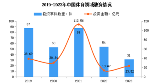 從體育行業(yè)投融資情況來看,2023年國內(nèi)體育相關(guān)公司的投融資事件共有31起,總額約23.52億元。2022年中國體育相關(guān)公司融資事件共有54起,總額為13.67億元。今年的投融資事件數(shù)與2022年相比減少42.59%,總投融資金額增加72.10%。