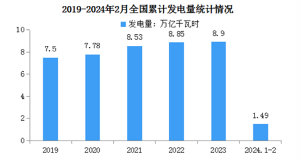 電力生產(chǎn)保持穩(wěn)定。2024年1-2月,規(guī)上工業(yè)發(fā)電量14870億千瓦時,同比增長8.3%,增速比上年12月份加快0.3個百分點(diǎn);日均發(fā)電247.8億千瓦時。