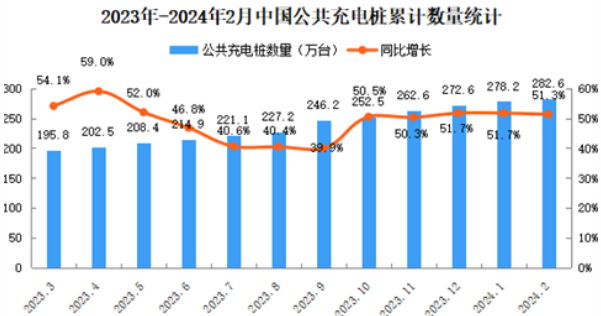 截至2024年2月,公共充電樁運(yùn)營量282.6萬臺,環(huán)比增加4.4萬臺,同比增長51.2%。其中直流充電樁123.9萬臺、交流充電樁158.6萬臺。從2023年3月到2024年2月,月均新增公共充電樁約8萬臺。