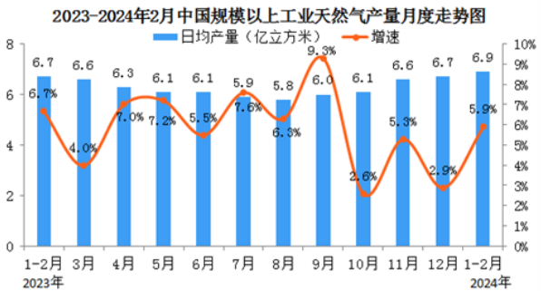 天然氣生產(chǎn)增速加快,進(jìn)口保持較快增長。1-2月份,規(guī)上工業(yè)天然氣產(chǎn)量417億立方米,同比增長5.9%,增速比上年12月份加快3.0個(gè)百分點(diǎn);日均產(chǎn)量6.9億立方米。進(jìn)口天然氣2210萬噸,同比增長23.6%,增速比上年12月份放緩0.1個(gè)百分點(diǎn)。