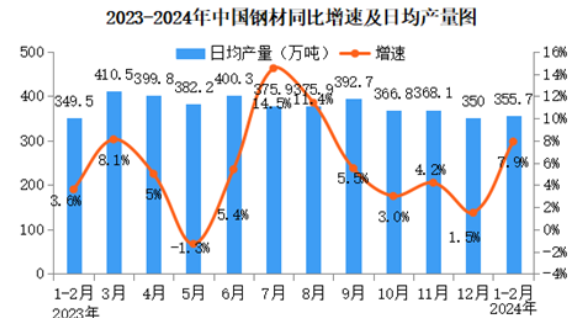 分產(chǎn)品看,1—2月份,619種產(chǎn)品中有418種產(chǎn)品產(chǎn)量同比增長(zhǎng)。其中,鋼材21343萬(wàn)噸,同比增長(zhǎng)7.9%;水泥18280萬(wàn)噸,下降1.6%;十種有色金屬1277萬(wàn)噸,增長(zhǎng)5.7%;乙烯515萬(wàn)噸,下降0.9%;汽車383.5萬(wàn)輛,增長(zhǎng)4.4%,其中新能源汽車118.9萬(wàn)輛,增長(zhǎng)25.6%;發(fā)電量14870億千瓦時(shí),增長(zhǎng)8.3%;原油加工量11876萬(wàn)噸,增長(zhǎng)3.0%。