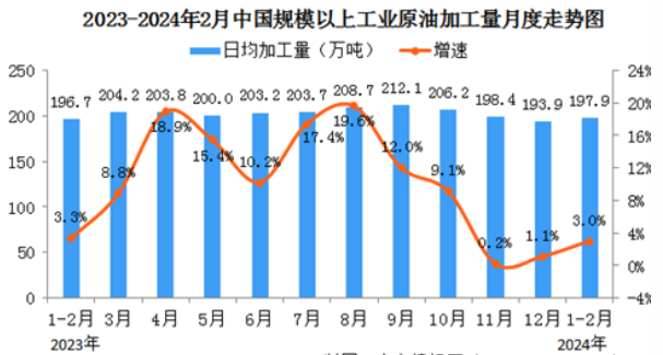 原油生產(chǎn)穩(wěn)定增長,進(jìn)口增速加快。2024年1-2月,規(guī)上工業(yè)原油產(chǎn)量3511萬噸,同比增長2.9%,增速比上年12月份放緩1.7個(gè)百分點(diǎn);日均產(chǎn)量58.5萬噸。進(jìn)口原油8831萬噸,同比增長5.1%,增速比上年12月份加快4.5個(gè)百分點(diǎn)。