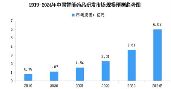 當(dāng)前中國智能藥品研發(fā)行業(yè)正處于快速成長期,利用AI技術(shù)革新傳統(tǒng)藥物研發(fā)流程,并在逐步解決現(xiàn)存問題的過程中,展現(xiàn)出巨大的發(fā)展?jié)摿蛷V闊的應(yīng)用前景。2023年中國智能藥品研發(fā)市場(chǎng)規(guī)模達(dá)到3.61億元,近五年年均復(fù)合增長率達(dá)46.67%。2024年中國智能藥品研發(fā)市場(chǎng)規(guī)模將增長至6.03億元。