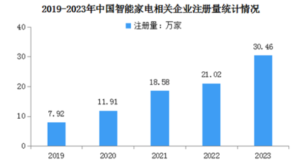 目前,我國智能家居相關(guān)企業(yè)數(shù)量約122.22萬家,呈現(xiàn)出蓬勃發(fā)展的態(tài)勢(shì)。企查查數(shù)據(jù)顯示,近五年來,智能家居企業(yè)的注冊(cè)量呈現(xiàn)出迅猛增長的態(tài)勢(shì),這一趨勢(shì)表明智能家居行業(yè)的巨大潛力,也反映出消費(fèi)者對(duì)于智能化、便捷化家居生活的強(qiáng)烈需求。特別是在2023年,智能家居企業(yè)注冊(cè)數(shù)量達(dá)到了30.46萬家,同比增長高達(dá)44.9%。