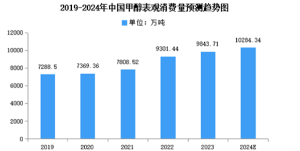 由于國內(nèi)經(jīng)濟平穩(wěn)增長,汽車、電器、化工等行業(yè)加速發(fā)展,近年來中國甲醇表觀消費量持續(xù)增長。2023年國內(nèi)甲醇表觀消費量達到9843.71萬噸,比2022年增加5.83%。2024年表觀消費量將達10284.34萬噸。