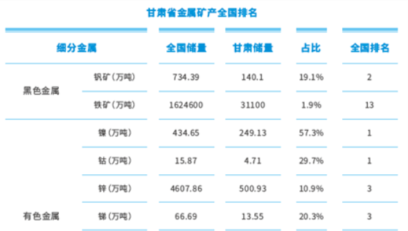 甘肅礦產(chǎn)資源種類豐富、有色和貴金屬資源優(yōu)勢明顯,截至2022年底,全省已發(fā)現(xiàn)各類礦產(chǎn)190種(含亞礦種),其中已查明礦產(chǎn)資源儲量的礦種134種。鎳、鈷、鉑、鈀、鋨、銥、銠、釕、硒、鑄型用粘土、凹凸棒石粘土等12種礦產(chǎn)儲量居全國第一位,鉻、鋅、鎢、金、碲、螢石、重晶石等53種礦產(chǎn)儲量居全國前五位。豐富的礦產(chǎn)資源為發(fā)展新材料產(chǎn)業(yè)起到有力支撐作用。