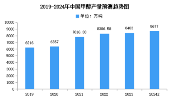 近年來,中國甲醇產(chǎn)量保持增長趨勢。2023年,國內(nèi)甲醇產(chǎn)量為8403萬噸,比2023年增加3.76%。2024年產(chǎn)量將達8677萬噸。