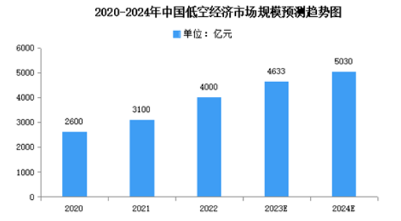 作為戰(zhàn)略性新興產(chǎn)業(yè),低空經(jīng)濟有望成為促進經(jīng)濟發(fā)展的新增長點。當(dāng)前,多地正積極搶抓低空經(jīng)濟產(chǎn)業(yè)密集創(chuàng)新和高速發(fā)展的戰(zhàn)略機遇期、黃金窗口期,加快形成低空經(jīng)濟產(chǎn)業(yè)集聚效應(yīng)和創(chuàng)新生態(tài),引領(lǐng)低空經(jīng)濟發(fā)展進入新賽道。2022年低空經(jīng)濟對國民經(jīng)濟的綜合貢獻值約為4000億元,同比增長29.03%。2023年市場規(guī)模將達4633億元,2024年將達5035億元。