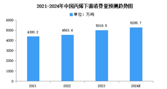 近年來(lái),丙烯產(chǎn)業(yè)鏈上下游持續(xù)擴(kuò)張,整體保持高景氣狀態(tài), 2023年丙烯下游消費(fèi)量達(dá)5018.5萬(wàn)噸,同比增長(zhǎng)9.97%。2024年中國(guó)丙烯下游消費(fèi)量將達(dá)5285.7萬(wàn)噸。