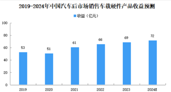 隨著中國(guó)汽車保有量的持續(xù)增長(zhǎng),汽車后市場(chǎng)行業(yè)銷售車載硬件產(chǎn)品出現(xiàn)同步增長(zhǎng)。中國(guó)汽車后市場(chǎng)行業(yè)銷售車載硬件產(chǎn)品總收益由2019年的53億元增至2023年的69億元,復(fù)合年增長(zhǎng)率為6.8%。2024年中國(guó)汽車后市場(chǎng)行業(yè)銷售車載硬件產(chǎn)品的總收益將達(dá)到72億元。