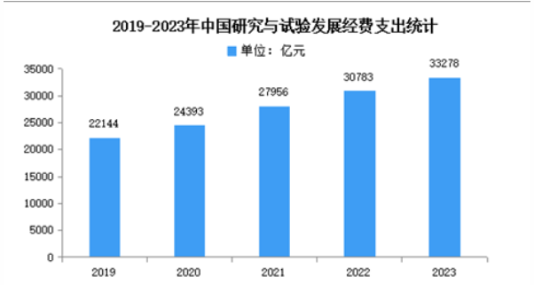 2023年研究與試驗(yàn)發(fā)展(R&D)經(jīng)費(fèi)支出33278億元,比上年增長(zhǎng)8.1%,與國(guó)內(nèi)生產(chǎn)總值之比為2.64%,其中基礎(chǔ)研究經(jīng)費(fèi)2212億元,比上年增長(zhǎng)9.3%,占R&D經(jīng)費(fèi)支出比重為6.65%。