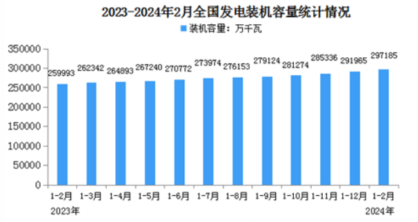 截至2月底,全國累計發(fā)電裝機容量約29.7億千瓦,同比增長14.7%。其中,太陽能發(fā)電裝機容量約6.5億千瓦,同比增長56.9%;風(fēng)電裝機容量約4.5億千瓦,同比增長21.3%。