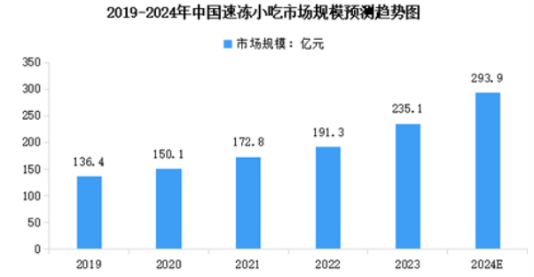 近年來(lái),中國(guó)速凍小吃市場(chǎng)規(guī)模持續(xù)擴(kuò)大。2023年中國(guó)速凍小吃市場(chǎng)規(guī)模達(dá)到235.1億元,近五年復(fù)合增長(zhǎng)率達(dá)14.58%。2024年中國(guó)速凍小吃市場(chǎng)規(guī)模將增長(zhǎng)至293.9億元。