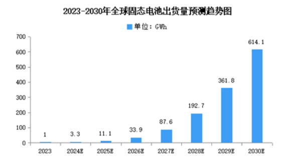 近年來,在新能源汽車市場的推動(dòng)下,全球固態(tài)電池出貨量持續(xù)增長。2023年全球固態(tài)電池出貨量約為1GWh,主要以半固態(tài)電池為主。隨著技術(shù)的不斷進(jìn)步和市場的不斷擴(kuò)大,固態(tài)電池有望成為主導(dǎo)電池技術(shù)之一。2024年全球固態(tài)電池出貨量將達(dá)到3.3GWh,2030年出貨量將增長至614.1GWh。