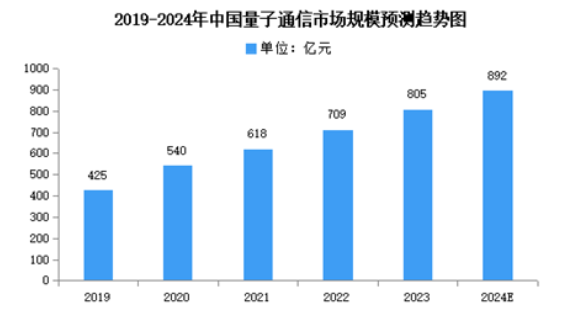 近年來(lái),在國(guó)家戰(zhàn)略指引下,量子通信備受市場(chǎng)關(guān)注,行業(yè)市場(chǎng)規(guī)模增長(zhǎng)迅速。我國(guó)量子通信市場(chǎng)規(guī)模由2019年的425億元增至2022年的709億元,年均復(fù)合增長(zhǎng)率為17.3%,2023年約為805億元。2024年我國(guó)量子通信市場(chǎng)規(guī)模有望增至892億元。