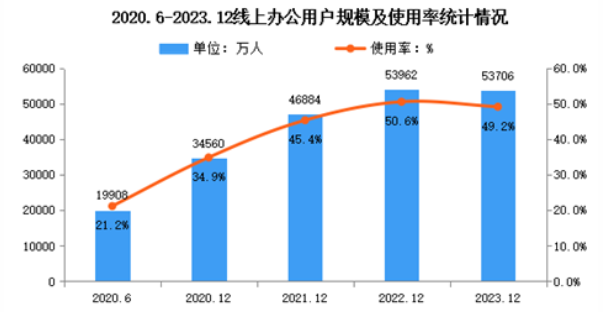 截至2023年12月,我國線上辦公用戶規(guī)模達(dá)5.37億人,占網(wǎng)民整體的49.2%。