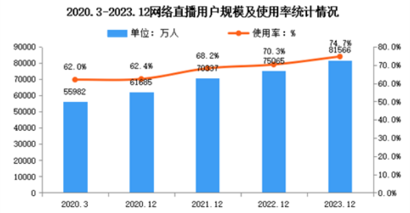 截至2023年12月,我國網(wǎng)絡(luò)直播用戶規(guī)模達(dá)8.16億人,較2022年12月增長6501萬人,占網(wǎng)民整體的74.7%。其中,電商直播用戶規(guī)模為5.97億人,較2022年12月增長8267萬人,占網(wǎng)民整體的54.7%;游戲直播用戶規(guī)模為2.97億人,較2022年12月增長3133萬人,占網(wǎng)民整體的27.2%;真人秀直播用戶規(guī)模為2.00億人,較2022年12月增長1259萬人,占網(wǎng)民整體的18.3%;演唱會(huì)直播用戶規(guī)模為2.23億人,較2022年12月增加1596萬人,占網(wǎng)民整體的20.4%;體育直播用戶規(guī)模為3.45億人,較2022年12月減少2847萬人,占網(wǎng)民整體的31.6%。