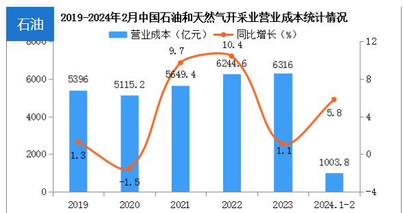 2024年1-2月,全國石油和天然氣開采業(yè)營業(yè)收入1957.9億元,同比增長4.6%;營業(yè)成本1003.8億元,同比增長5.8%;利潤總額652.2億元,同比增長1.8%。