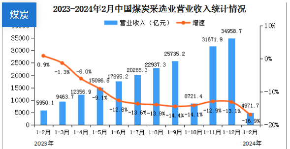 2024年1-2月,規(guī)模以上工業(yè)企業(yè)實(shí)現(xiàn)營業(yè)收入19.44萬億元,同比增長4.5%。采礦業(yè)營業(yè)務(wù)收入9022.8億元,同比下降7.6%。其中,煤炭開采和洗選業(yè)實(shí)現(xiàn)營業(yè)收入4971.7億元,同比下降16.9%。