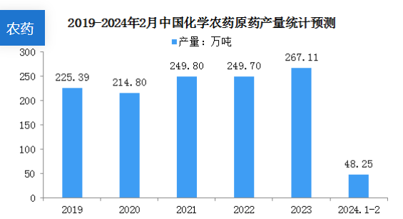 近年來我國農(nóng)藥工業(yè)快速發(fā)展,已形成了一套包括科研開發(fā)、原藥生產(chǎn)、制劑加工、原材料及中間體配套較為完整的農(nóng)藥工業(yè)體系,農(nóng)藥的產(chǎn)量與出口量已處于世界前列。數(shù)據(jù)顯示,2023年全國化學農(nóng)藥原藥產(chǎn)量為267.11萬噸,小幅增長。2024年1-2月全國化學農(nóng)藥原藥產(chǎn)量為267.11萬噸,同比增長13.4%。