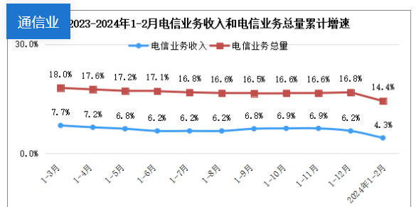 2024年1-2月份,電信業(yè)務收入穩(wěn)步提升,電信業(yè)務總量保持兩位數增長,5G、千兆光纖網絡建設有序推進,用戶規(guī)模持續(xù)擴大,移動數據流量呈快速增長態(tài)勢,通信行業(yè)整體實現(xiàn)平穩(wěn)起步。