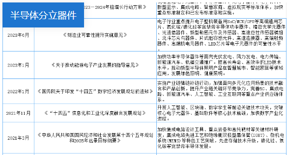 近年來,中國半導(dǎo)體分立器件受到各級政府的高度重視和國家產(chǎn)業(yè)政策的重點支持。國家陸續(xù)出臺了多項政策,鼓勵半導(dǎo)體分立器件產(chǎn)業(yè)發(fā)展與創(chuàng)新,《電子信息制造業(yè)2023—2024年穩(wěn)增長行動方案》《制造業(yè)可靠性提升實施意見》《關(guān)于推動能源電子產(chǎn)業(yè)發(fā)展的指導(dǎo)意見》等產(chǎn)業(yè)政策為半導(dǎo)體分立器件行業(yè)的發(fā)展提供了明確、廣闊的市場前景,為企業(yè)提供了良好的生產(chǎn)經(jīng)營環(huán)境。