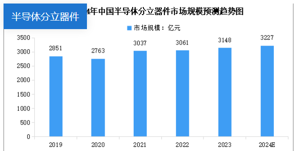 受益于電子產(chǎn)品需求的增長(zhǎng)、新興技術(shù)的推動(dòng)以及半導(dǎo)體行業(yè)的快速發(fā)展,中國(guó)半導(dǎo)體分立器件市場(chǎng)規(guī)模穩(wěn)步增長(zhǎng)。2023年中國(guó)半導(dǎo)體分立器件市場(chǎng)規(guī)模達(dá)到約3148億元,近五年復(fù)合增長(zhǎng)率為2.51%。2024年中國(guó)半導(dǎo)體分立器件市場(chǎng)規(guī)模將達(dá)到3227億元。
