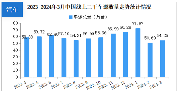 2024年3月,二手車車源量54.26萬臺,呈回升趨勢,但復(fù)蘇的力度仍然較弱,環(huán)比漲幅不到10%,同比增長3.1%。新車持續(xù)降價(jià)導(dǎo)致二手車市場的觀望氣氛仍較重。