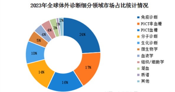 從細(xì)分領(lǐng)域看,在2023年全球體外診斷市場(chǎng)中免疫診斷市場(chǎng)份額最大,占據(jù)了24%的市場(chǎng)份額;POCT非血糖、POCT血糖、分子診斷、生化診斷的市占率均在10%以上,市場(chǎng)份額分別為17%、16%、14%、10%。