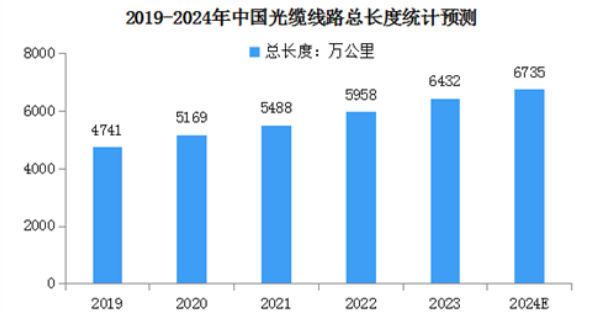 近年來,5G網(wǎng)絡(luò)的建設(shè)及千兆光纖的升級(jí)等帶動(dòng)市場(chǎng)需求持續(xù)提升,光纜線路總長(zhǎng)度穩(wěn)步增加。2023年全光網(wǎng)建設(shè)快速推進(jìn),新建光纜線路長(zhǎng)度473.8萬公里,全國(guó)光纜線路總長(zhǎng)度達(dá)6432萬公里。2024年全國(guó)光纜線路總長(zhǎng)度有望增至6735萬公里。