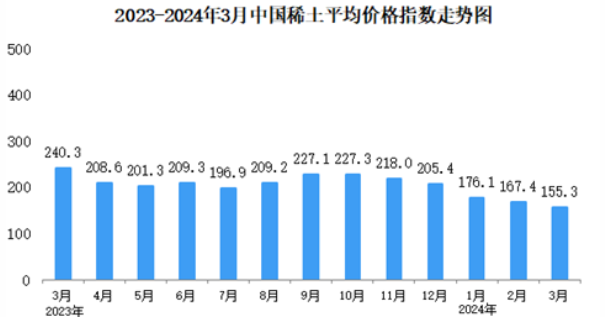 2024年3月,稀土價(jià)格指數(shù)總體呈現(xiàn)下行態(tài)稀土價(jià)格指數(shù)基本保持平穩(wěn)。本月平均價(jià)格指數(shù)為155.3點(diǎn)。價(jià)格指數(shù)最高為3月1日的157.5點(diǎn),最低為3月19日的153.3點(diǎn)。高低點(diǎn)相差4.2點(diǎn),波動(dòng)幅度約為2.7%。