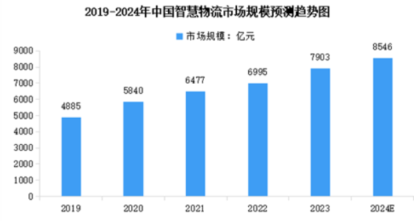 當(dāng)前中國(guó)智慧物流行業(yè)發(fā)展環(huán)境向好,市場(chǎng)規(guī)模呈高速增長(zhǎng)狀態(tài)。2023年中國(guó)智慧物流行業(yè)市場(chǎng)規(guī)模約為7903億元,較上年增長(zhǎng)12.98%。2024年中國(guó)智慧物流市場(chǎng)規(guī)模將達(dá)到8546億元。
