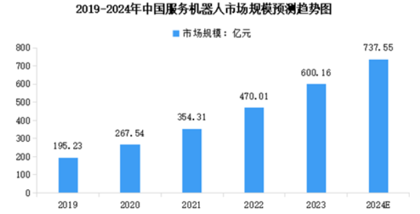 國民購買力的提高、人力成本的上升、老齡化的加速等因素共同推動了服務機器人在各個領(lǐng)域的應用和發(fā)展,當前我國服務機器人產(chǎn)業(yè)總體發(fā)展水平穩(wěn)步提升。2023年中國服務機器人市場規(guī)模達到約600.16億元,近五年年均復合增長率達32.41%。2024年中國服務機器人市場規(guī)模將達到737.55億元。