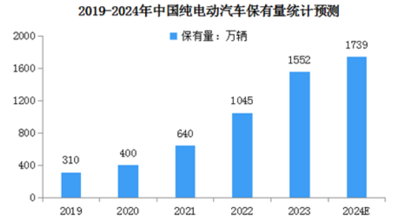 電動汽車的保有量受到市場需求、政策支持、技術(shù)進(jìn)步以及充電基礎(chǔ)設(shè)施的完善等多種因素的影響。截至2023年底,全國新能源汽車保有量達(dá)2041萬輛,占汽車總量的6.07%。其中,純電動汽車保有量1552萬輛,占新能源汽車保有量的76.04%。中商產(chǎn)業(yè)研究院分析師預(yù)測,2024年我國純電動汽車保有量將達(dá)到1739萬輛。