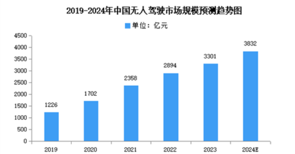 目前,我國積極發(fā)展智能網(wǎng)聯(lián)汽車,無人駕駛技術(shù)進(jìn)一步推動BAT等企業(yè)進(jìn)入市場、加大投入研發(fā)技術(shù),無人駕駛市場正處于快速發(fā)展階段。2023年我國無人駕駛市場規(guī)模約為3301億元,同比增長14.1%。2024年我國自動駕駛市場規(guī)模將達(dá)3832億元。
