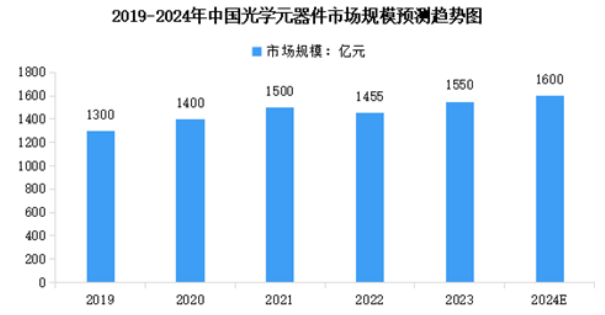 光學(xué)元器件被譽(yù)為人工智能、物聯(lián)網(wǎng)、數(shù)字經(jīng)濟(jì)等新興信息技術(shù)的“眼睛”。在宏觀環(huán)境及疫情影響下,2022年度光學(xué)元器件的主要應(yīng)用領(lǐng)域如消費(fèi)電子、安防監(jiān)控、工業(yè)制造等的市場需求下滑,光學(xué)元器件的整體市場規(guī)模近十年內(nèi)首次出現(xiàn)下滑。2022年度國內(nèi)光學(xué)鏡片、鏡頭及模組等元器件的市場規(guī)模為1455億元,同比下滑3%。2024年中國光學(xué)元器件市場規(guī)模將恢復(fù)至1600億元。