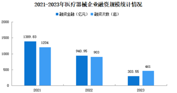 2023年中國(guó)醫(yī)療器械融資次數(shù)為461次,同比下降48.9%;已公開的融資金額為303.55億元,同比下降67.7%。2023年超億元級(jí)融資事件為123起,同比下降46.1%,超十億級(jí)融資事件為6起,同比下降71.4%(根據(jù)已公開的融資金額統(tǒng)計(jì))。