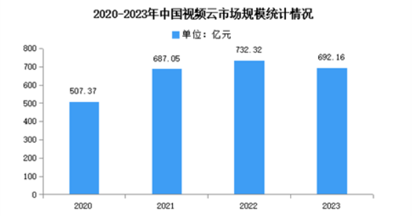 受疫后終端用戶娛樂需求增長放緩、行業(yè)客戶縮減IT支出、大客戶增加自建比例、大型活動對直播解決方案周期性影響等多重因素作用。2023年中國視頻云市場規(guī)模達到約為692.16億元(94.8億美元),同比下降5.48%。