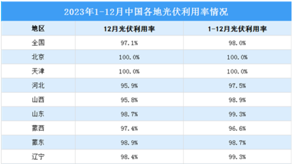 2023年,全國光伏利用率達98.0%,北京、天津、上海、江蘇、浙江、安徽等11個省市光伏利用率達100%;2023年12月,全國光伏利用率達97.1%,北京、天津、上海、江蘇、浙江等13省市光伏利用率達100%。