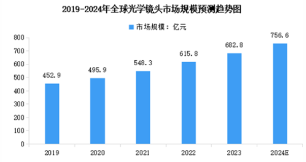 隨著5G、AI、云計(jì)算、物聯(lián)網(wǎng)等行業(yè)數(shù)字技術(shù)深度融合,構(gòu)建完整產(chǎn)業(yè)驅(qū)動(dòng)鏈,光學(xué)鏡頭市場(chǎng)增長(zhǎng)空間較大。2022年全球光學(xué)鏡頭市場(chǎng)規(guī)模達(dá)615.8億元,較上年增長(zhǎng)12.31%。2024年全球光學(xué)鏡頭市場(chǎng)規(guī)模將增至756.6億元。