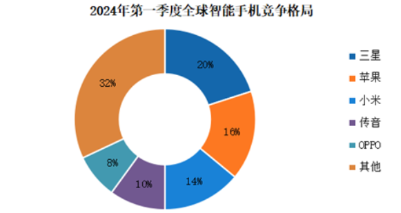 在GalaxyAI的積極推動(dòng)下,三星以20%的市場(chǎng)份額重歸榜首;蘋(píng)果位居第二,市場(chǎng)份額為16%,在其戰(zhàn)略重點(diǎn)市場(chǎng)上面臨挑戰(zhàn);由于小米新品走量機(jī)型紅米A3的競(jìng)爭(zhēng)優(yōu)勢(shì),其以14%的市場(chǎng)份額位居第三;傳音以10%的市場(chǎng)份額位居第四;OPPO以8%的市場(chǎng)份額位居第五。