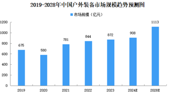 受益于經(jīng)濟(jì)增長疊加疫后戶外習(xí)慣延續(xù),國內(nèi)戶外裝備需求加速提升。戶外裝備基本不會在非戶外場景使用,市場增速的提升真實反映出戶外運(yùn)動參與率的提升。中國戶外裝備市場規(guī)模由2019年675億元增至2023年的872億元。2023-2028年中國戶外裝備市場規(guī)模的CAGR為5%,2024年中國戶外裝備市場規(guī)模將超900億元,2028年有望突破千億元,達(dá)到1113億元。