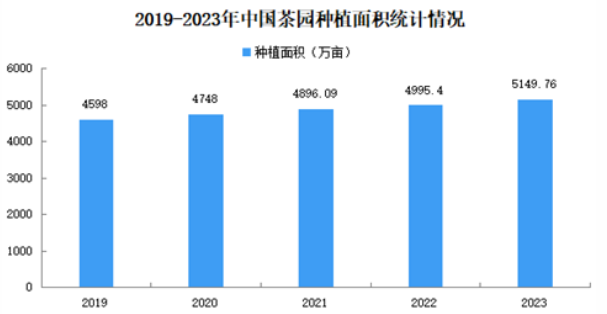 近年來,各地重視控制茶園面積規(guī)模增長,新增茶園的面積增幅持續(xù)收窄。2023年全國茶園面積5149.76萬畝,同比增加154.36萬畝,增幅3.09%。全國已開采茶園面積為4650.16萬畝,同比增加110.27萬畝。全國目前仍有499.6萬畝新茶園未開采。