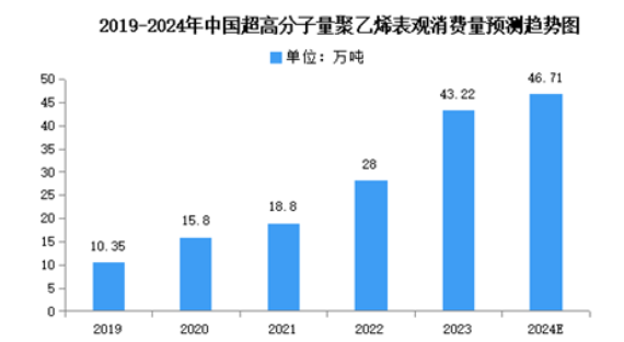 超高分子量聚乙烯是一種高分子化合物,很難加工,并且具有超強(qiáng)的耐磨性、自潤滑性,強(qiáng)度比較高、化學(xué)性質(zhì)穩(wěn)定、抗老化性能強(qiáng),F(xiàn)階段纖維是超高分子量聚乙烯最大消費(fèi)領(lǐng)域。根據(jù)數(shù)據(jù)統(tǒng)計(jì),2023年我國超高分子量聚乙烯總消費(fèi)量約為43.22萬噸,同比增長54.36%。2024年表觀消費(fèi)量將達(dá)46.71萬噸。
