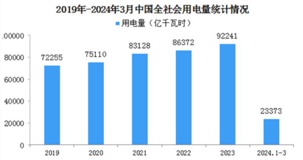 2024年1-3月,全社會用電量累計23373億千瓦時,同比增長9.8%,其中規(guī)模以上工業(yè)發(fā)電量為22372億千瓦時。從分產(chǎn)業(yè)用電看,第一產(chǎn)業(yè)用電量288億千瓦時,同比增長9.7%;第二產(chǎn)業(yè)用電量15056億千瓦時,同比增長8.0%;第三產(chǎn)業(yè)用電量4235億千瓦時,同比增長14.3%;城鄉(xiāng)居民生活用電量3794億千瓦時,同比增長12.0%。